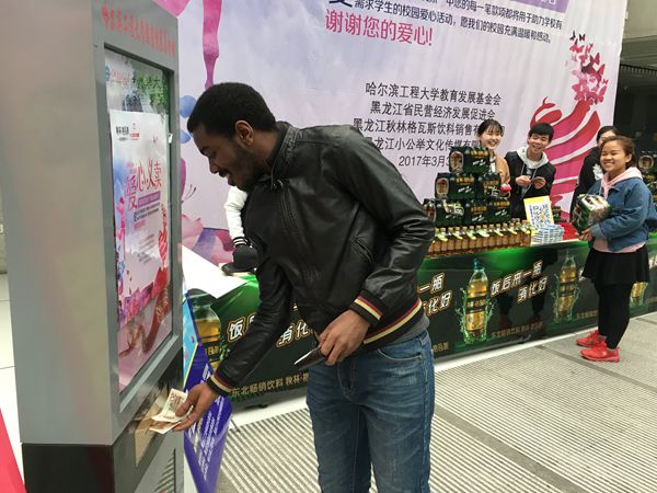 活动开始,途经的广大师生便纷纷参与进来,很多人不仅购买饮料,而且所余零钱也都投入了捐款箱。在活动中,校教工足球队一次就购买6打饮料,离退休处、后勤集团、经管学院等单位的领导老师也纷纷慷概解囊,我校的非洲留学生也来到现场购买饮料奉献爱心,基金会也为奉献爱心的师生回赠了爱心纪念品。
